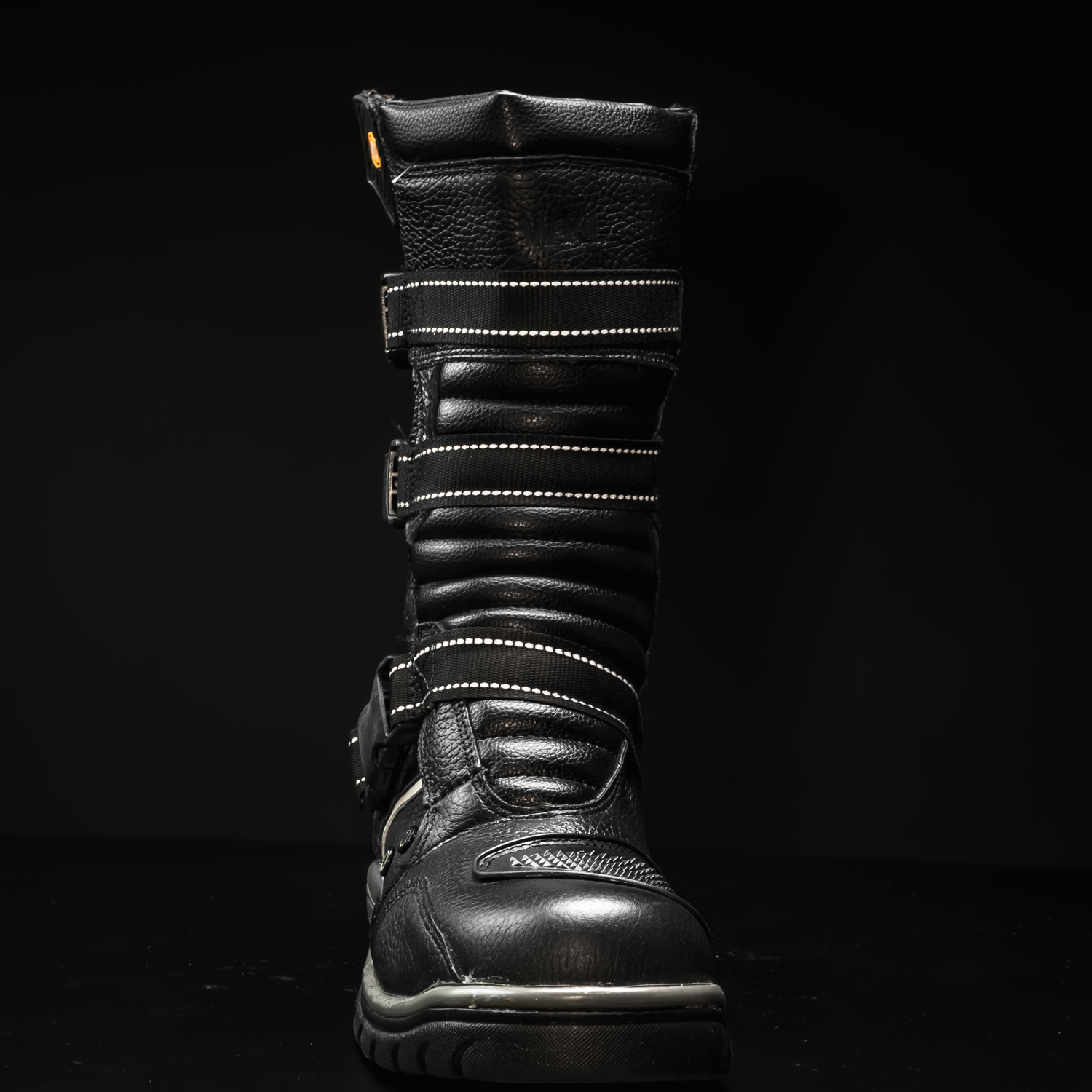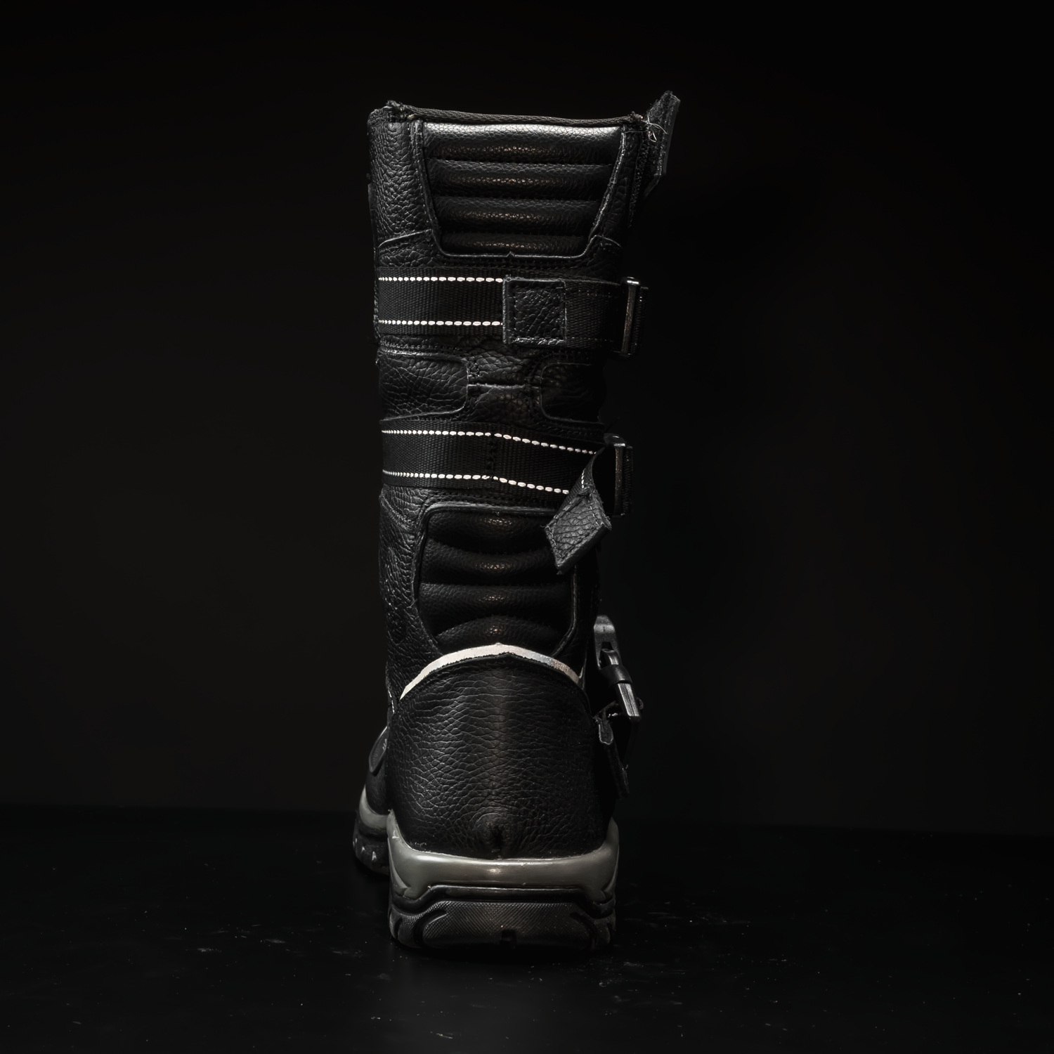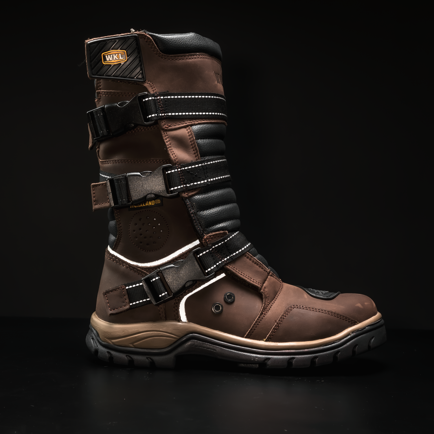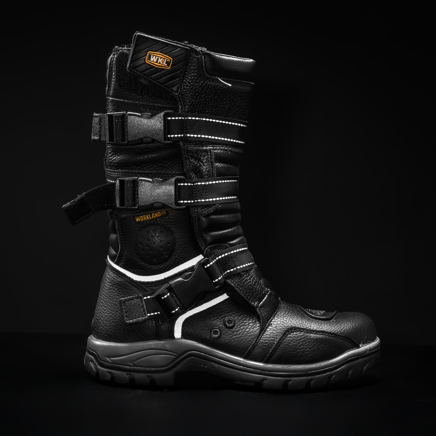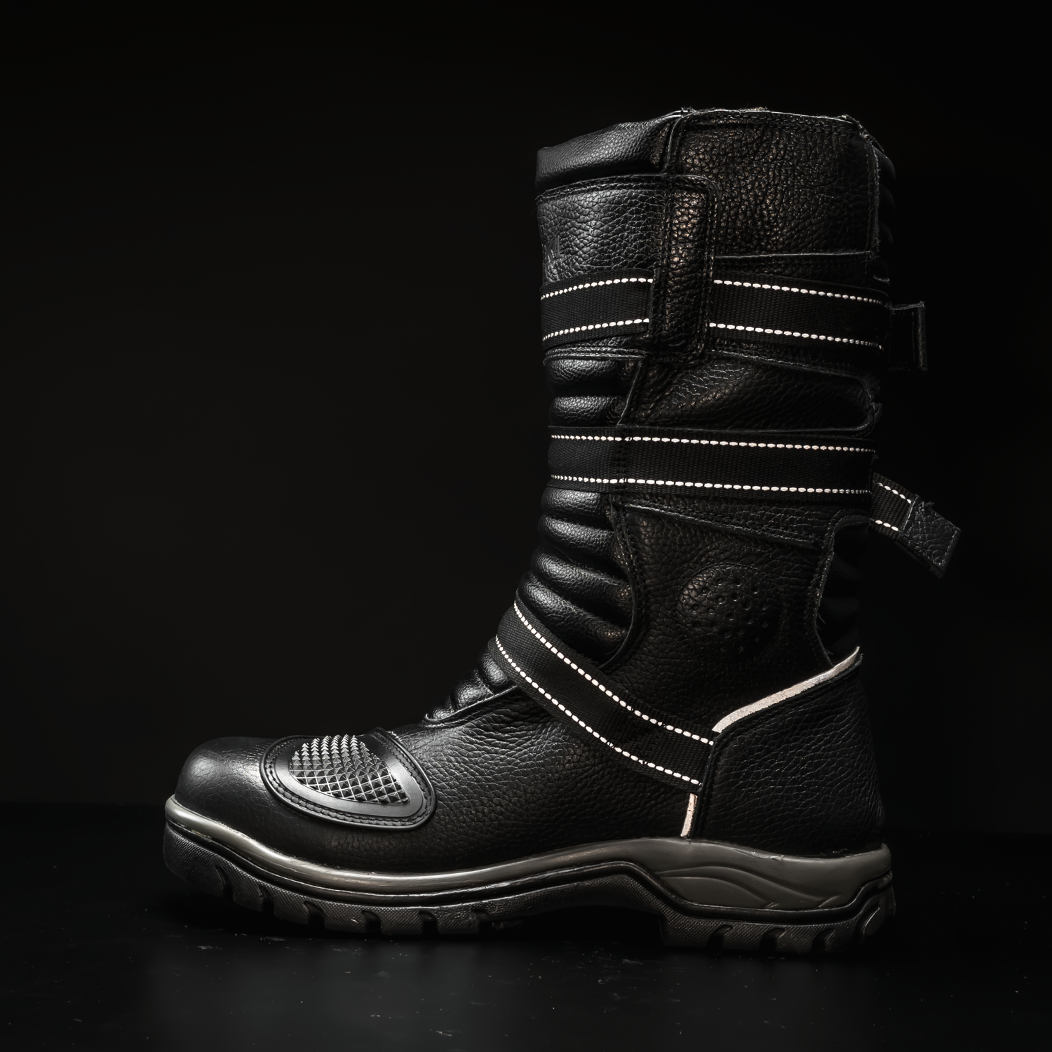 A tall, armored profile wraps the shin and ankle while three quick-release straps lock in a confident fit. Reflective bands trace the boot for low-light visibility. A lugged rubber sole anchors every step. It’s protection that disappears once you’re on the move.